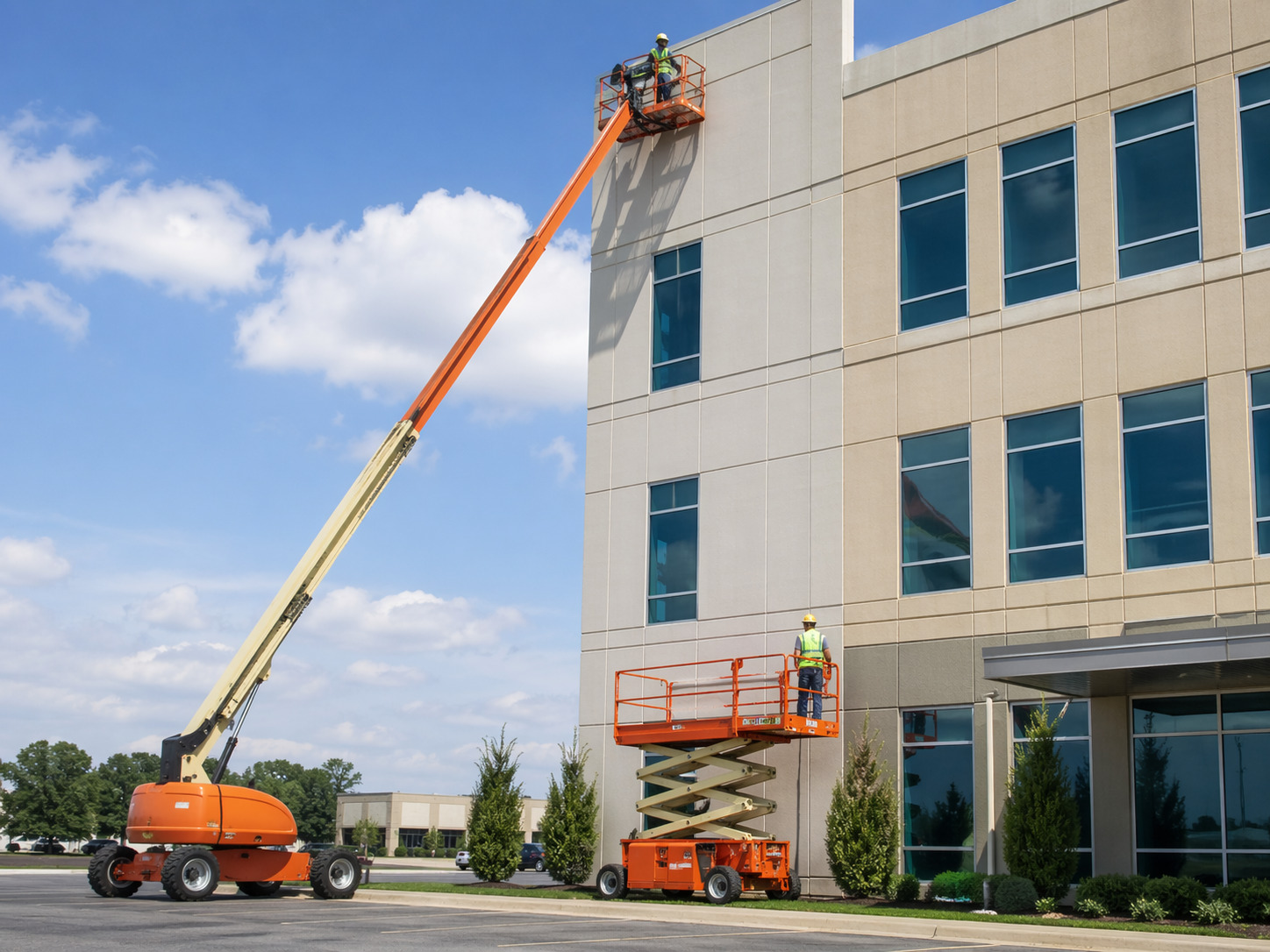 Nacela foarfecă merge aproape drept în sus. Este foarte bună când ai nevoie de lucru vertical, pe suprafețe relativ plane, în hale, depozite, spații comerciale, fațade accesibile sau șantiere unde nu trebuie să ocolești obstacole mari.